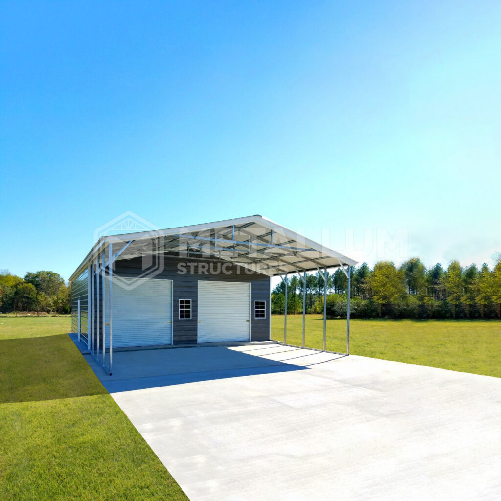 When size is a priority, the 30x50x9 Combo is a great option. Combining garage and carport, this large structure offers protection from the elements and flexibility, making it a perfect fit for multifunctional spaces. Introducing our versatile 30x50x9 Combo building, a perfect solution for combining storage and workspace in one efficient structure. This spacious and durable building offers ample room for both storing your valuable items and conducting various activities. With dimensions of 30 feet in width, 50 feet in length, and a peak height of 9 feet, this combo building provides generous space to accommodate your storage and workspace needs. Whether you require secure storage for equipment, tools, or vehicles, or a dedicated area for workshops, offices, or other commercial activities, this building offers the flexibility to meet your requirements. The steel frame is engineered to withstand the elements and resist rust and corrosion, ensuring the long-lasting protection of your valuable items and a sturdy workspace for your activities. The building offers a flexible layout, allowing you to partition the space to suit your specific needs. Create separate sections for storage and workspace, or customize the interior to meet your unique requirements. The open design provides ample room for organizing and optimizing the functionality of your storage and work areas. Experience the convenience and flexibility of a well-designed combo building that caters to your unique requirements and supports your business or personal endeavors effectively.